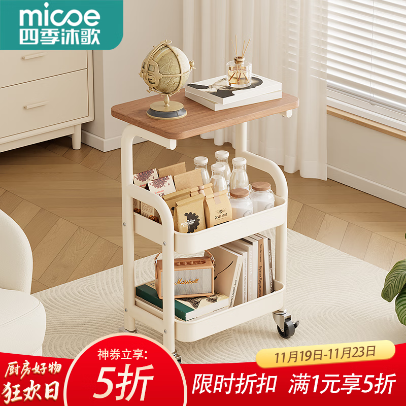 四季沐歌厨房置物架落地折叠小推车置物架免安装零食收纳储物移动果蔬菜篮 【中古风】奶白色-三层