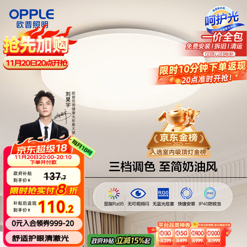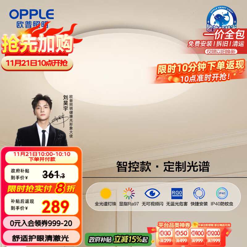 欧普(OPPLE)全光谱护眼吸顶灯卧室灯智能LED照明灯具简约现代快装圆形包安装