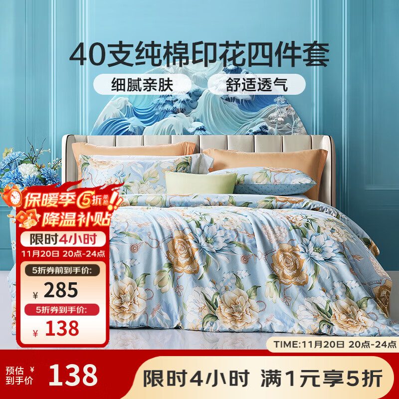 富安娜家纺 圣之花 床上四件套纯棉斜纹单双人全棉床单被罩 【圣之花】四件套-蓝海音 1.5米床 床单款 (被套203*229cm)