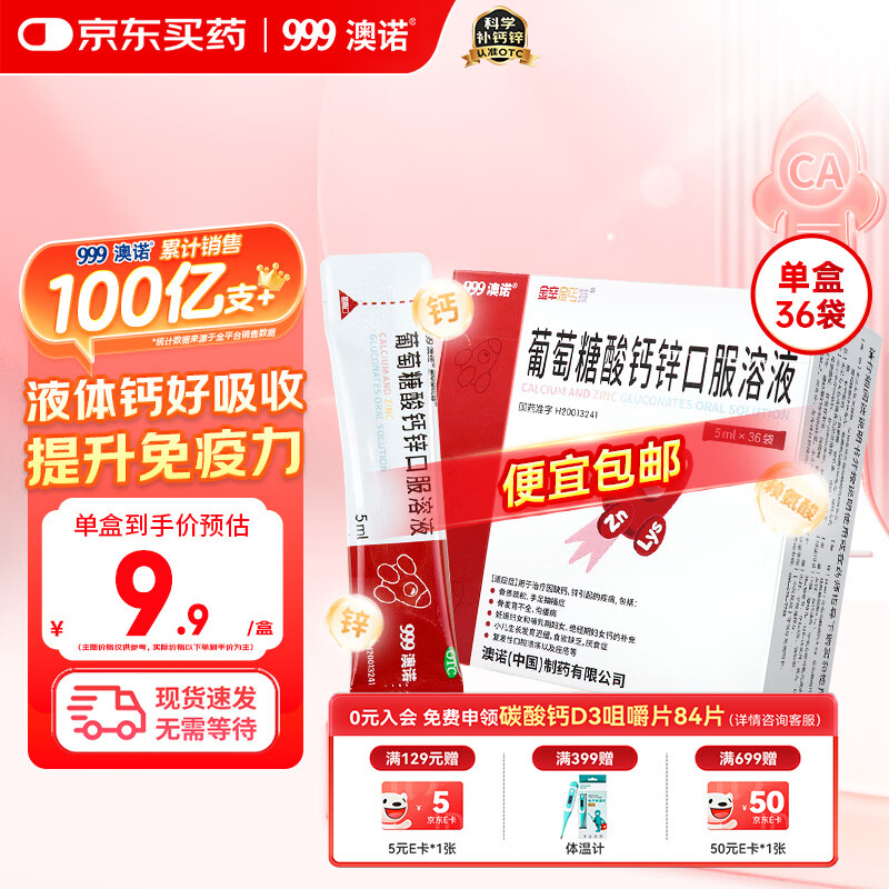 澳诺【效期至26年3月】葡萄糖酸钙锌口服溶液 5ml*36袋 补钙补锌 999澳诺钙锌口服溶液 儿童补钙锌 液体钙