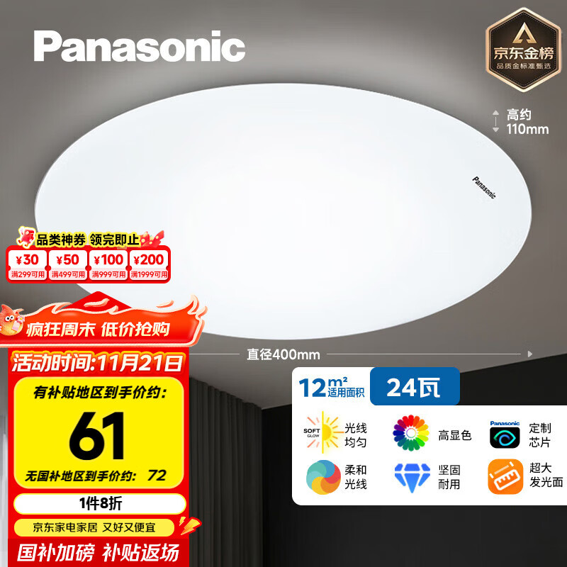 松下(Panasonic)灯LED灯吸顶灯客厅卧室灯具高显色 圆形24瓦素白HHXC2221L
