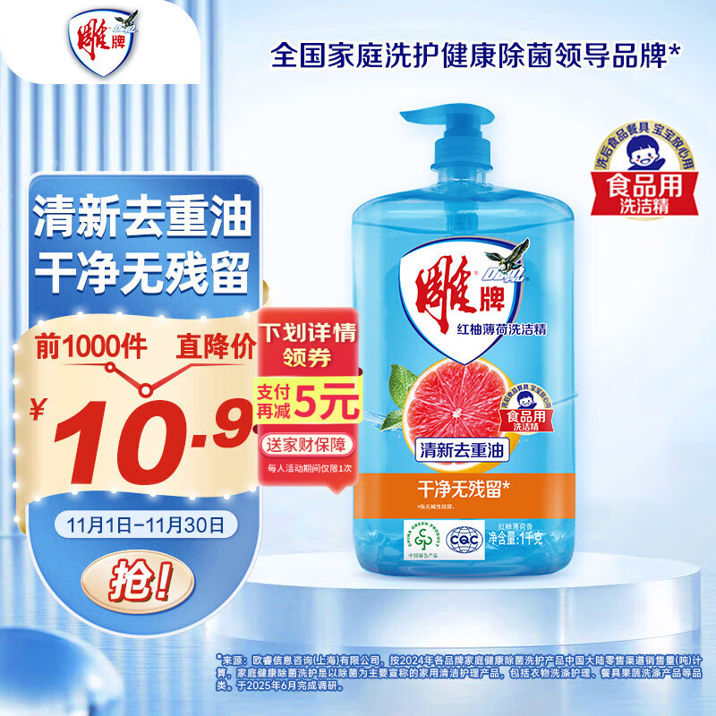 雕牌 红柚薄荷洗洁精1kg 火锅烧烤去重油 烧焦食物附着 隔夜凝固油渍
