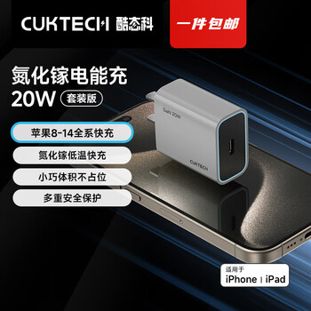 CUKTECH酷态科充电器 iPhone16充电头 PD20W快充 氮化镓充电器 Type-C适用苹果16/15/14/iPad手机平板 高性能氮化镓快充头 灰色 GaN20W氮化镓快充充电器