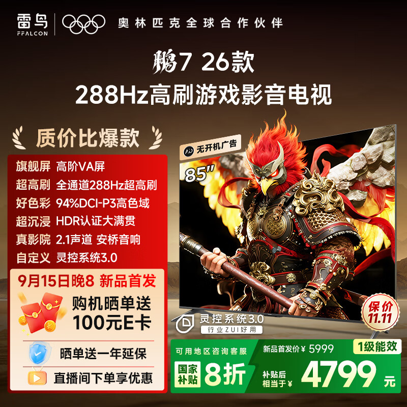FFALCON雷鸟电视鹏7 26款 85英寸 高阶VA全通道288Hz高刷 满血HDMI2.1安桥音响95%P3色域灵控系统 电视机