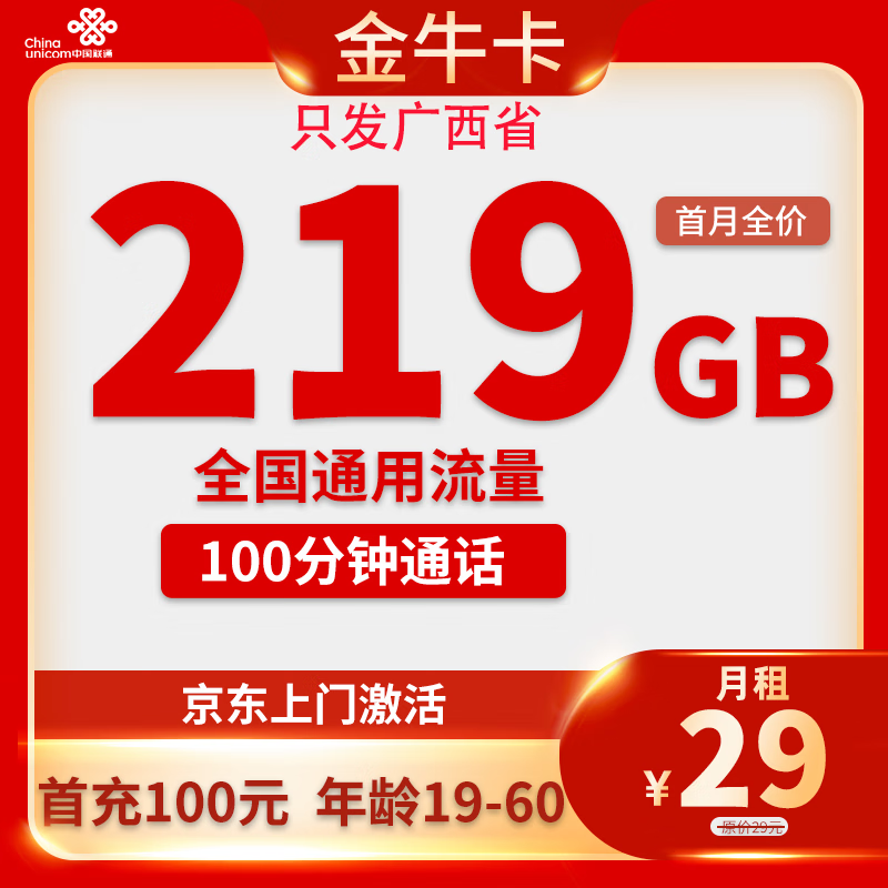 中国联通电话卡全国通用大流量卡不限速5g手机卡上网卡 只发广西省金牛卡29元219G全国流量100分钟