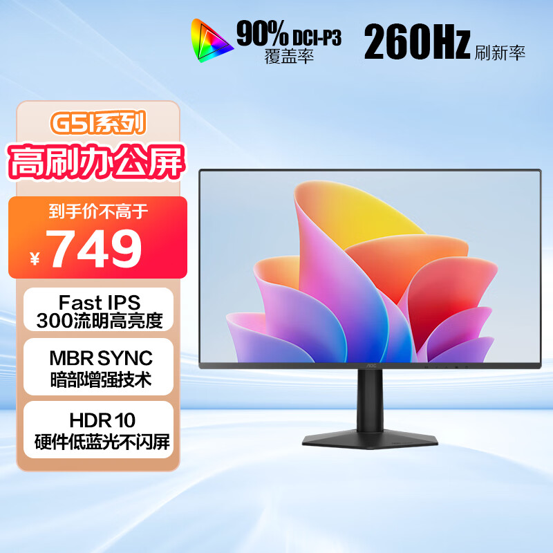 AOC 27英寸 240Hz超频260Hz 快速液晶1ms HDR每台出厂校色 硬件低蓝光不闪 游戏电竞电脑显示器27G51Z