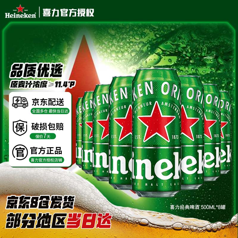 喜力Heineken 经典啤酒 500ml*8罐装 量贩装 中秋送礼