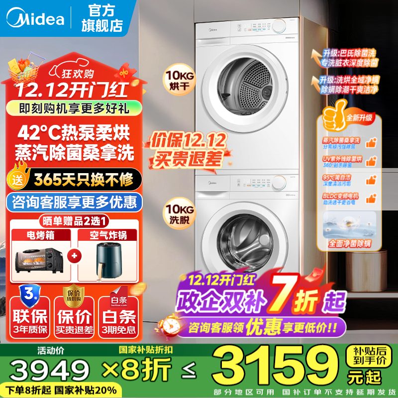 美的(Midea)洗烘套装 10KG滚筒洗衣机+热泵烘干机 巴氏除菌洗 除螨除潮 以旧换新 MG100V11FPRO+MH100V11F