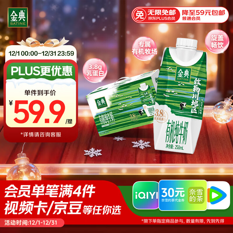 伊利金典3.8g乳蛋白有机全脂纯奶250ml*10盒新老包装随机 礼盒装