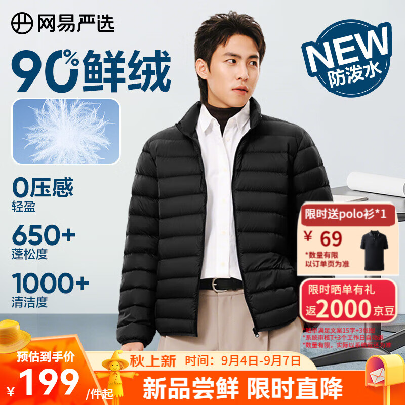 网易严选25新品90鸭绒轻暖羽绒服保暖0压感防泼水蓄热抗菌外套抗静电 A款25秋冬90鲜绒立领-水墨黑 L