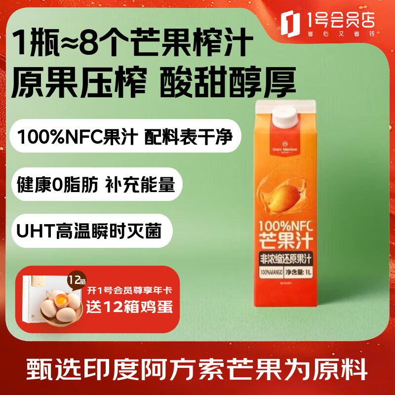 1号会员店100%NFC芒果汁 0脂0添加纯果蔬汁鲜果水果榨汁饮品饮料1L试用装