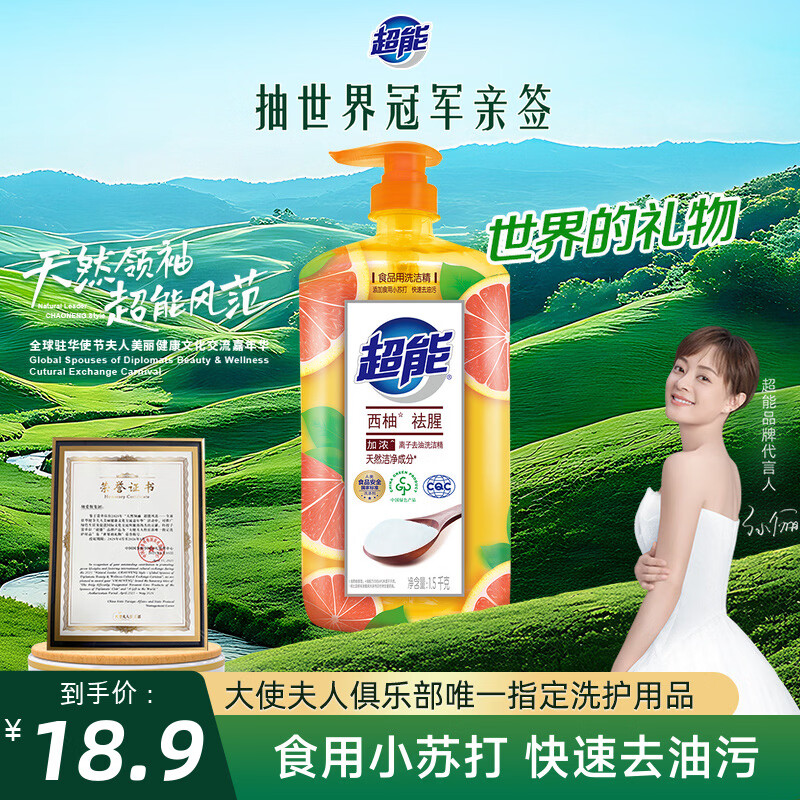 超能 离子去油洗洁精(西柚祛腥)1.5kg 加浓 食用小苏打去油污