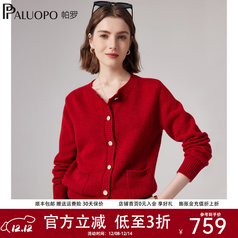 帕罗(PALUOPO)100%山羊绒衫女秋冬新款长袖开衫百搭打底保暖厚圣诞红针织毛衣 大红夹花 M 160/100