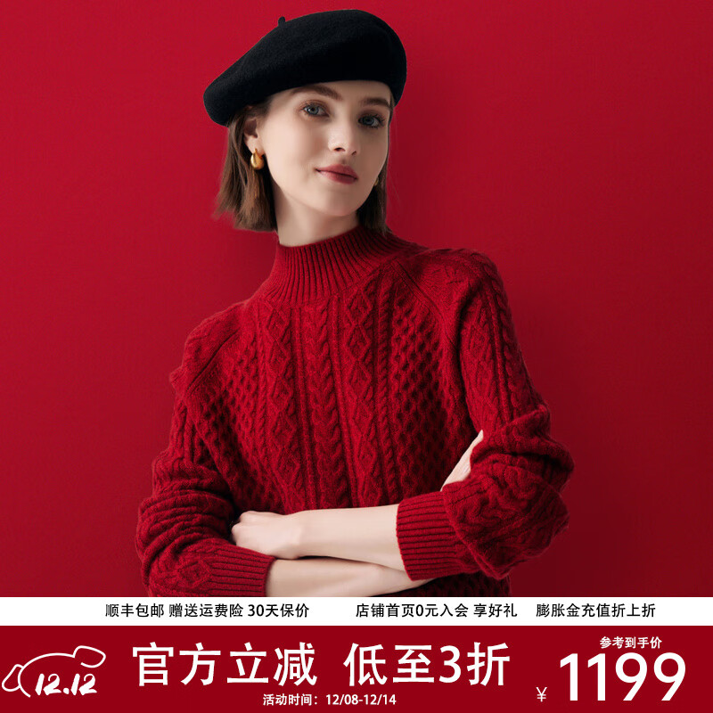 PALUOPO25冬季新款纯色半高领绞花女纯羊绒衫套头衫保暖毛衣ET20067R 大红夹花 XL (110)