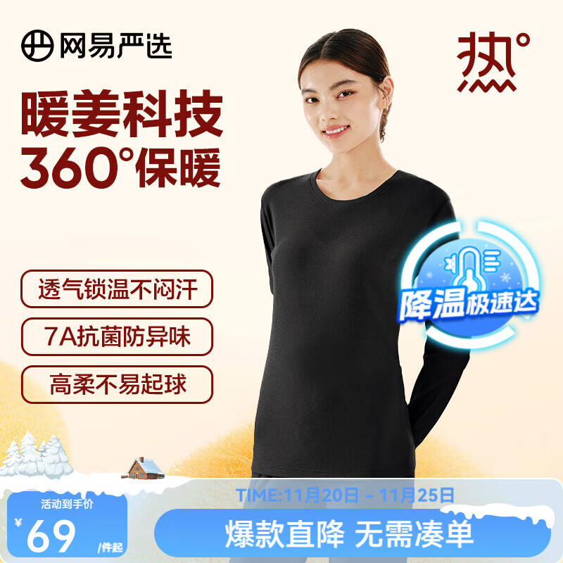 网易严选新品热咖302暖姜保暖内衣240g重磅7A抗菌柔软透气不闷汗秋衣秋裤 B款230g-水墨黑-女 L