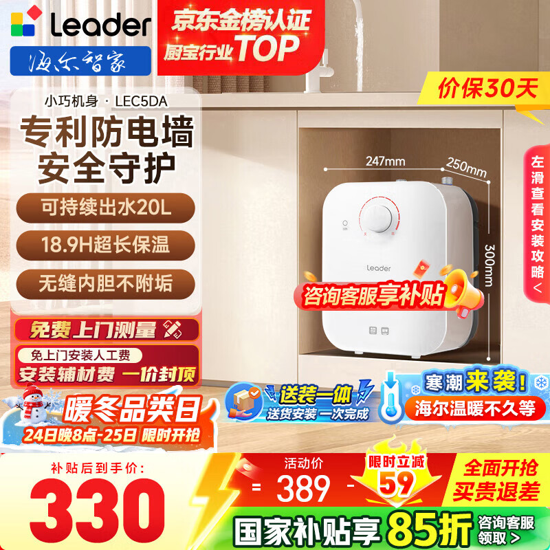 海尔(Haier)【咨询客服享补贴】智家出品Leader统帅5升电热水器小厨宝DA/TP家用厨房速热长效保温储水式小尺寸 5L 1750W 性价比首选5升DA小厨宝