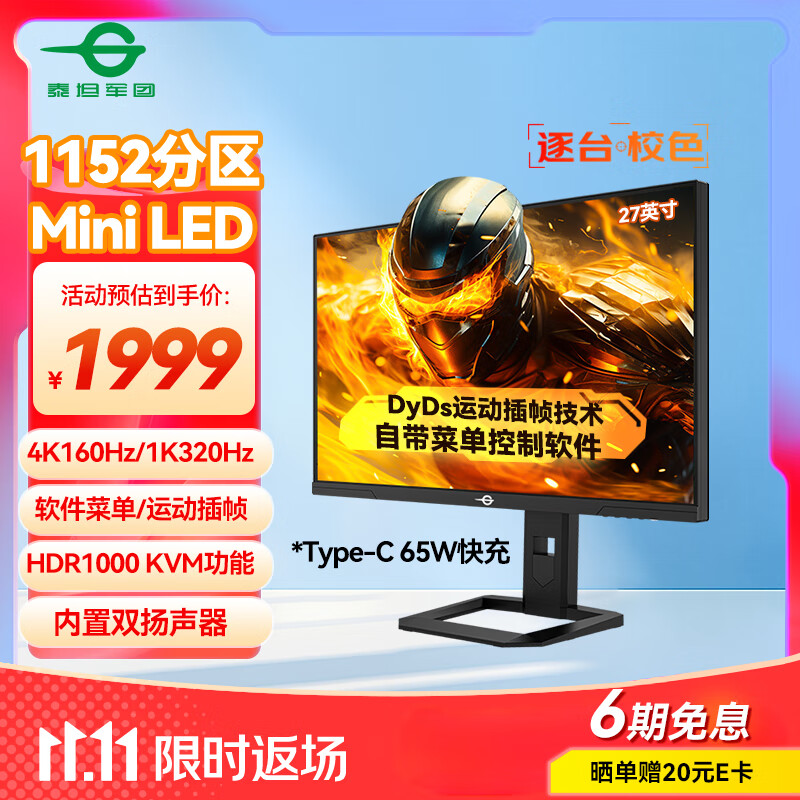 泰坦军团27英寸QD-MiniLED 4K 160Hz双模320Hz DyDs技术 Type-C 65W 内置音箱电竞显示器P275MV PLUS增强版