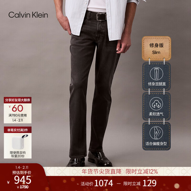 自营Calvin KleinJeans四季款男士经典休闲通勤ck黑色洗水修身显瘦微弹牛仔裤