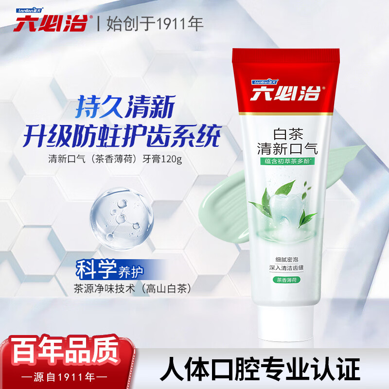 自营六必治白茶清新口气牙膏180g含氟防蛀成人男女士薄荷去口臭减少口气异味