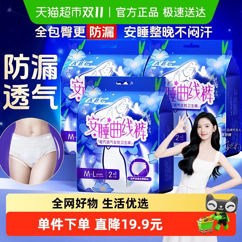 ABC裤型卫生巾姨妈巾安睡裤安心裤超长夜用防漏棉柔超吸M-L码9条