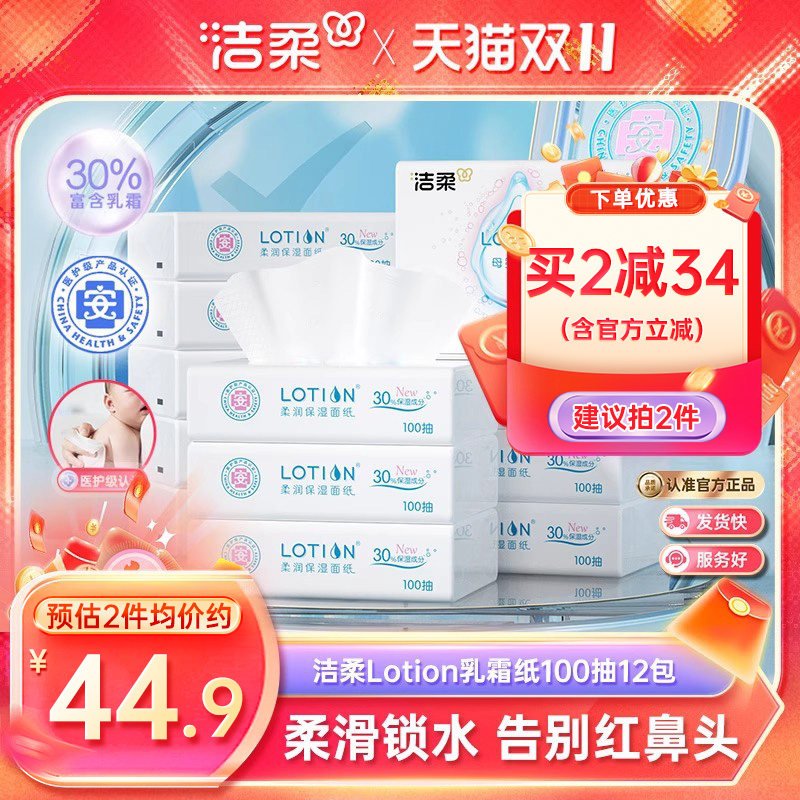 旗舰店洁柔纸巾Lotion婴儿专用保湿纸3层12包鼻敏感云柔巾乳霜纸实惠装