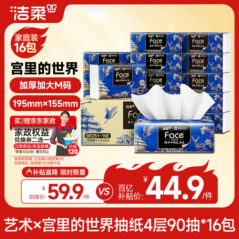 自营洁柔抽纸 艺术油画×宫里的世界 4层90抽16包 大尺寸面巾纸 整箱纸巾