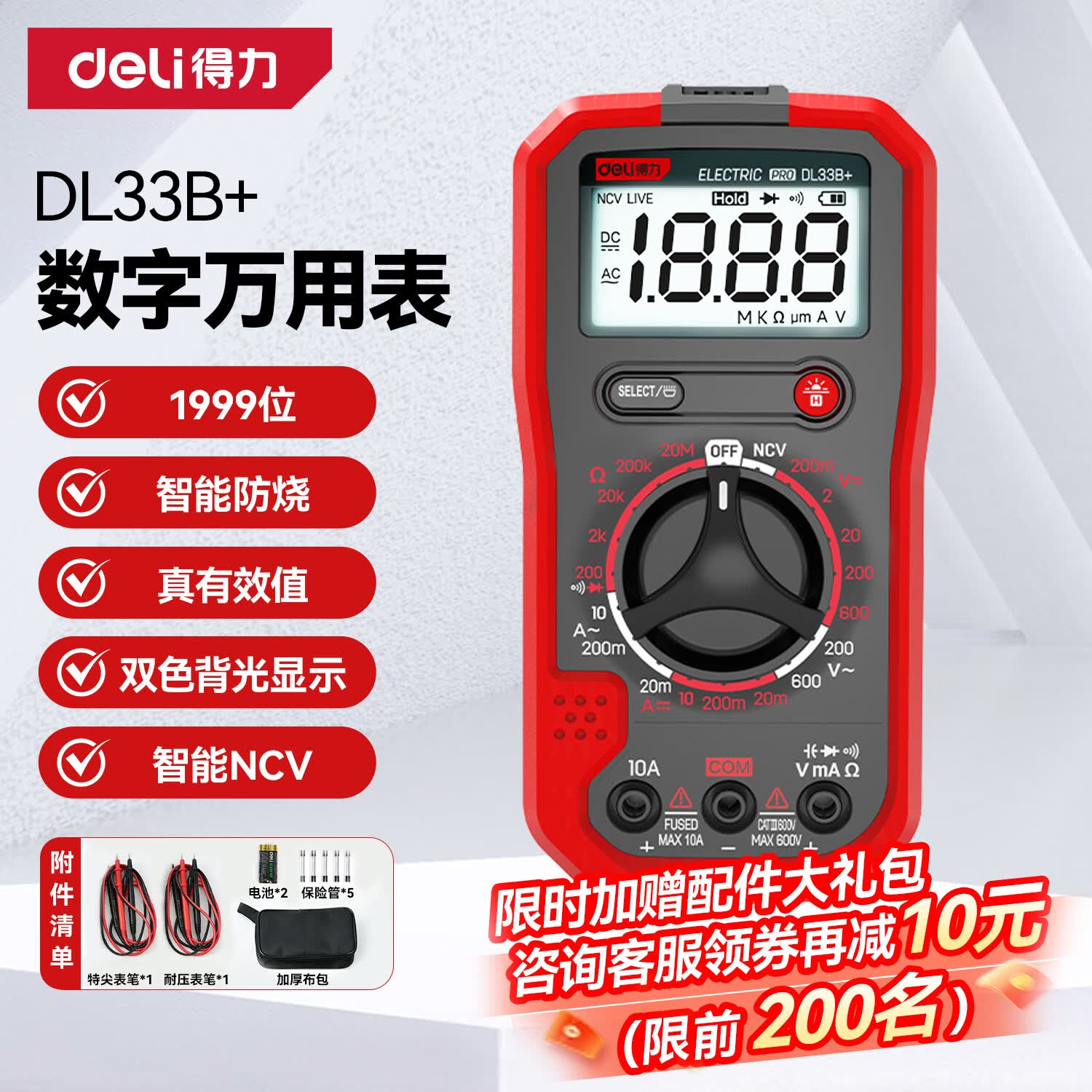 自营得力(deli)智能防烧万用表数字背光数显家用高精度电压NCV数字万能表 DL33B+