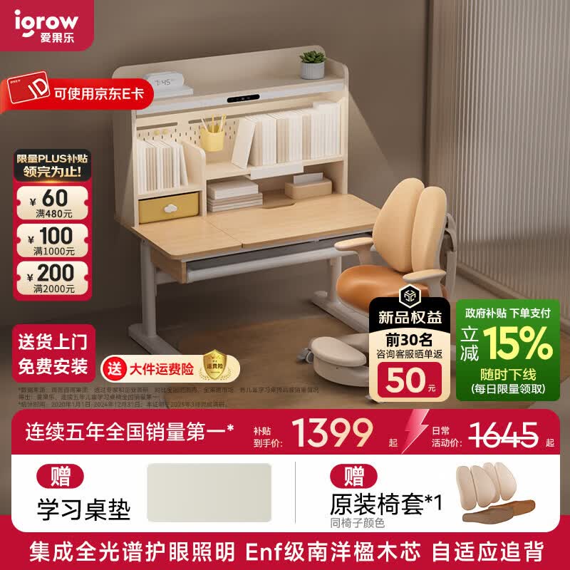 旗舰店爱果乐(IGROW)学习桌儿童书桌电脑桌书架书柜一体写字桌实木书桌椅儿童学习桌椅 1m几何猫W2+星轨椅【重力自适应追背】