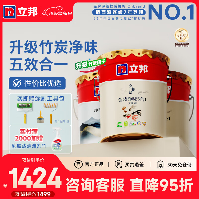 旗舰店立邦乳胶漆京雅居金标超值金装净味5合1环保面漆油漆内墙漆家用涂料 【升级竹炭净味】 54L*1件 套装(2面1底)