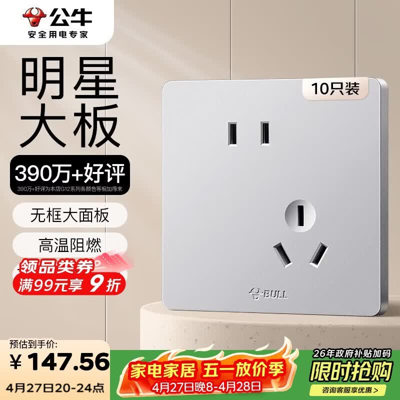 自营公牛(BULL)G12量贩装10A斜五孔插座奶油风86型G12Z223AS太空银十只装套装