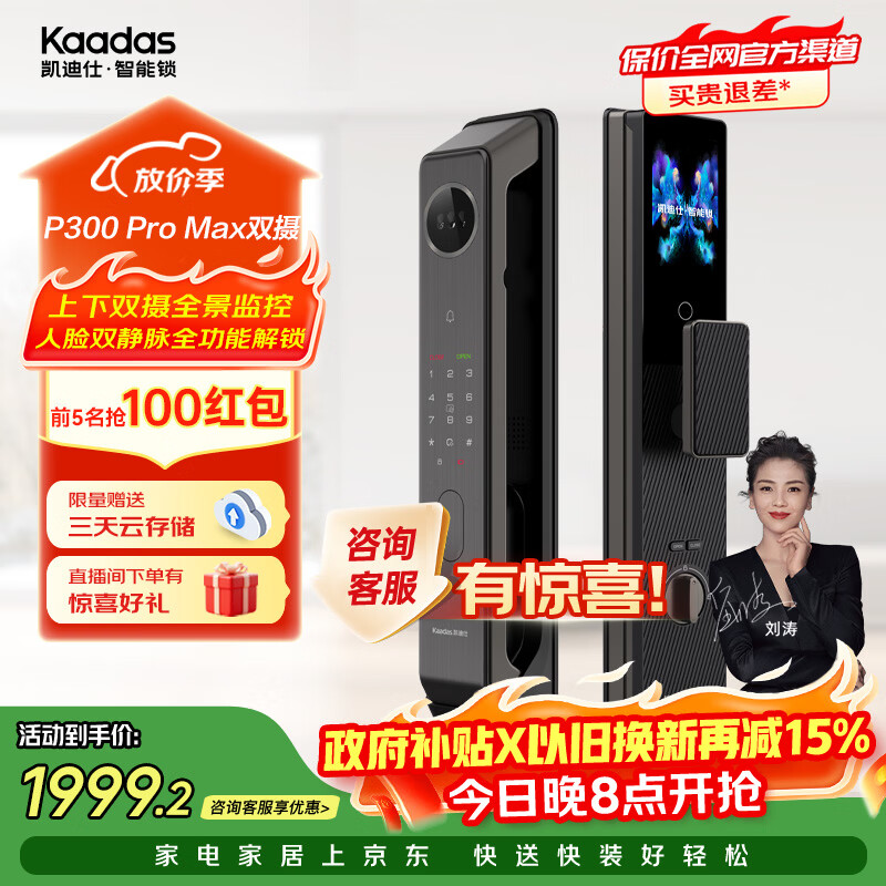 旗舰店凯迪仕(KAADAS)P300 Pro Max双摄智能门锁掌指静脉识别密码锁猫眼智能锁防盗门锁 P300 Pro Max双摄