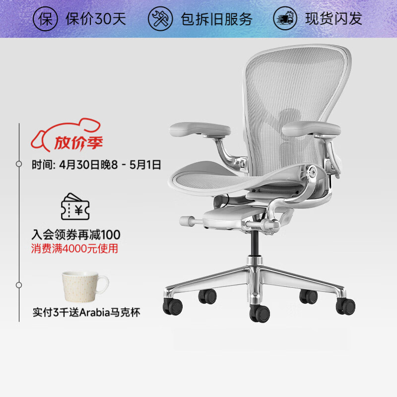 自营赫曼米勒(HERMAN MILLER)【现货】 AERON二代人体工学电脑办公椅可调腰托倾仰 矿石白中号