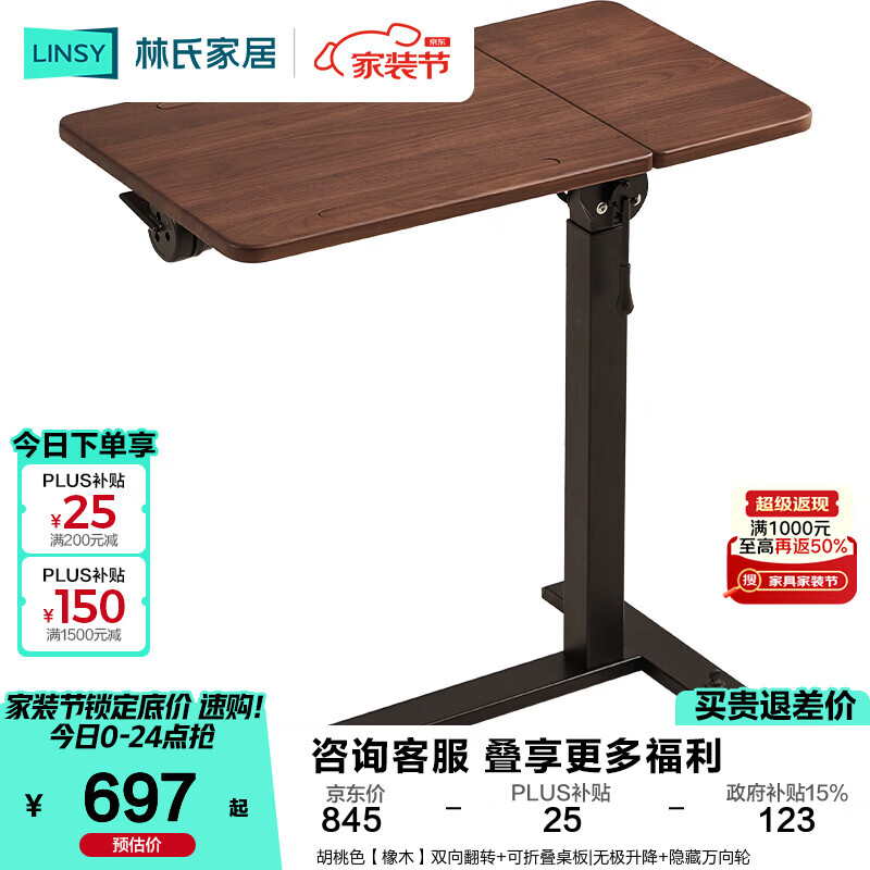 旗舰店林氏家居可移动床边桌电脑桌小型家用书桌升降桌子边几办公桌木业BG082 胡桃色【橡木】双向翻转+可折叠桌板 无极升降+隐藏万向轮