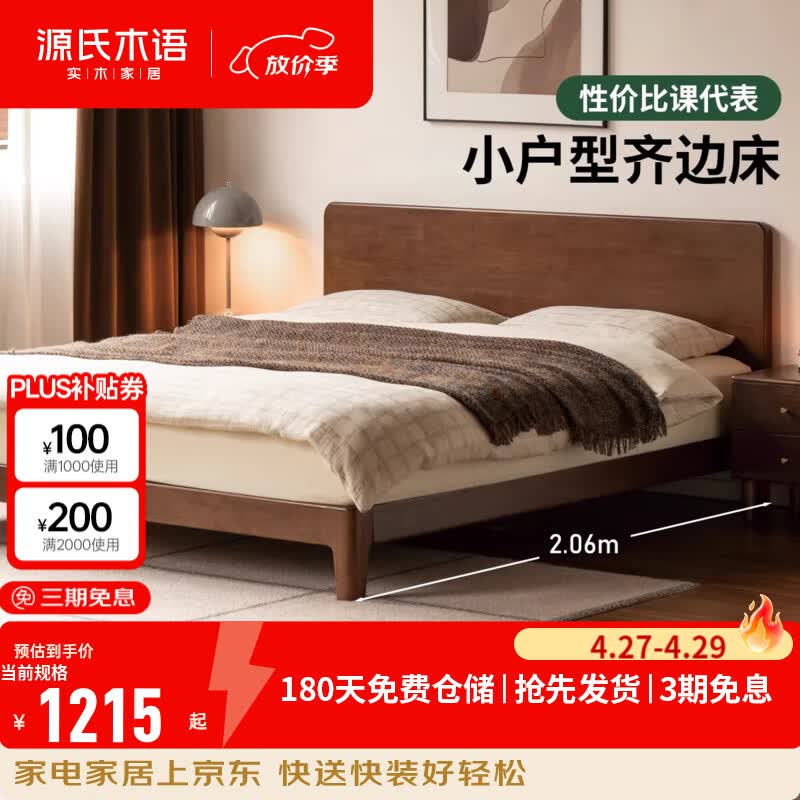 旗舰店源氏木语实木床现代简约大板床卧室小户型齐边床家用胡桃色双人床 【9】(胡桃色)实木床1.5*2.0m