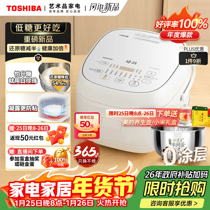 自营东芝(TOSHIBA)【旗舰爆款】白珍珠0涂层电饭煲4-5人无涂层316L不锈钢家用低糖电饭煲4升一级能效RC-15HOVC(W)