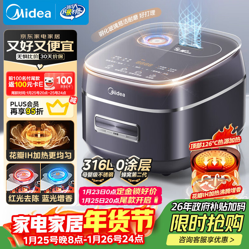 自营美的(Midea)电饭锅3-4人4-5人0涂层316L不锈钢内胆花瓣IH电饭煲稻香新风4L家用可预约米饭锅MB-40HB3政府补贴