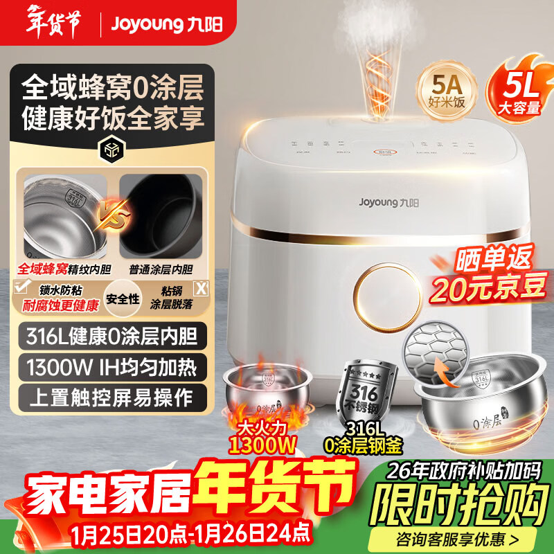自营九阳(Joyoung)时尚电饭煲0涂层1代全域蜂窝316L不锈钢5升4-6人IH加热5A级好米饭多功能不粘锅家用电饭锅50F560L