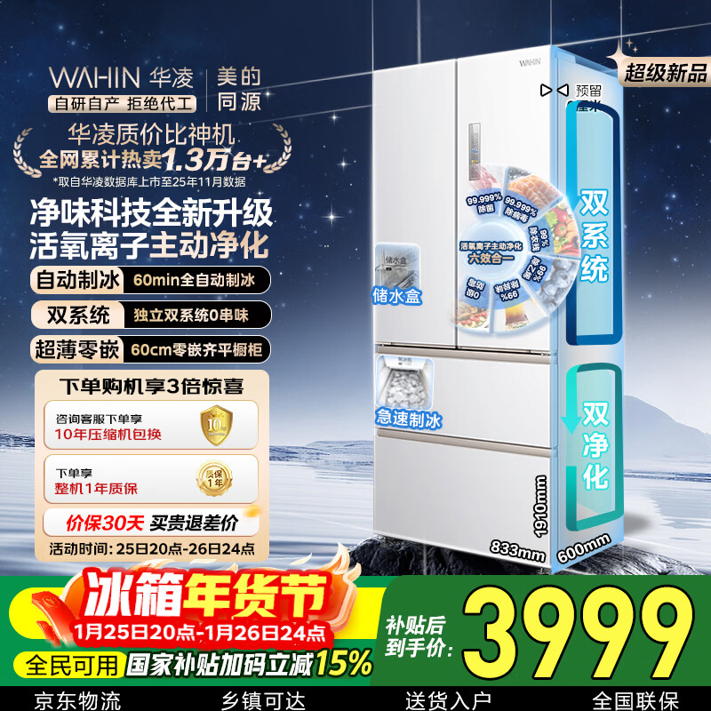 自营华凌美的出品神机518L法式多门冰箱自动制冰双系统主动净化超薄零嵌入大容量HR-518WUFIPZ国家补贴