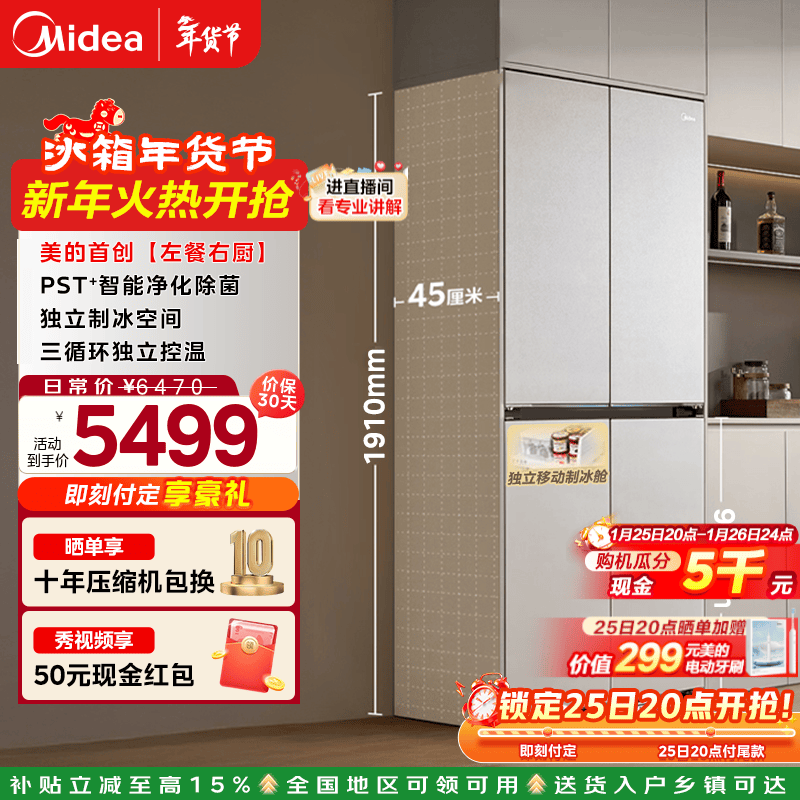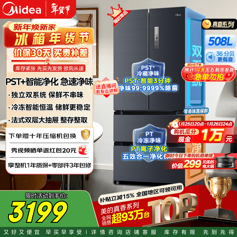 旗舰店美的(Midea)508升法式多门家用电冰箱除菌净味双系统大容量冰箱家电真香系列 BCD-508WTPZM(E) 补贴立减 508升双系统净味冰箱