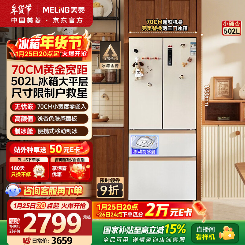 自营美菱(MeiLing)小确杏502L法式多门冰箱70cm宽制冰超薄嵌入式大容量变频底部散热杏悦白BCD-502WFP9CZX国家补贴