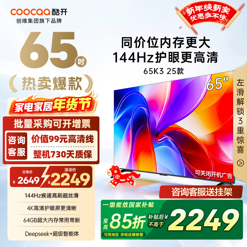 旗舰店酷开创维电视K3系列 2025款65英寸144Hz高刷64GB大内存全面屏一级能效液晶电视机创维65a3f同款65P3F 65英寸 电视 65K3 2025款