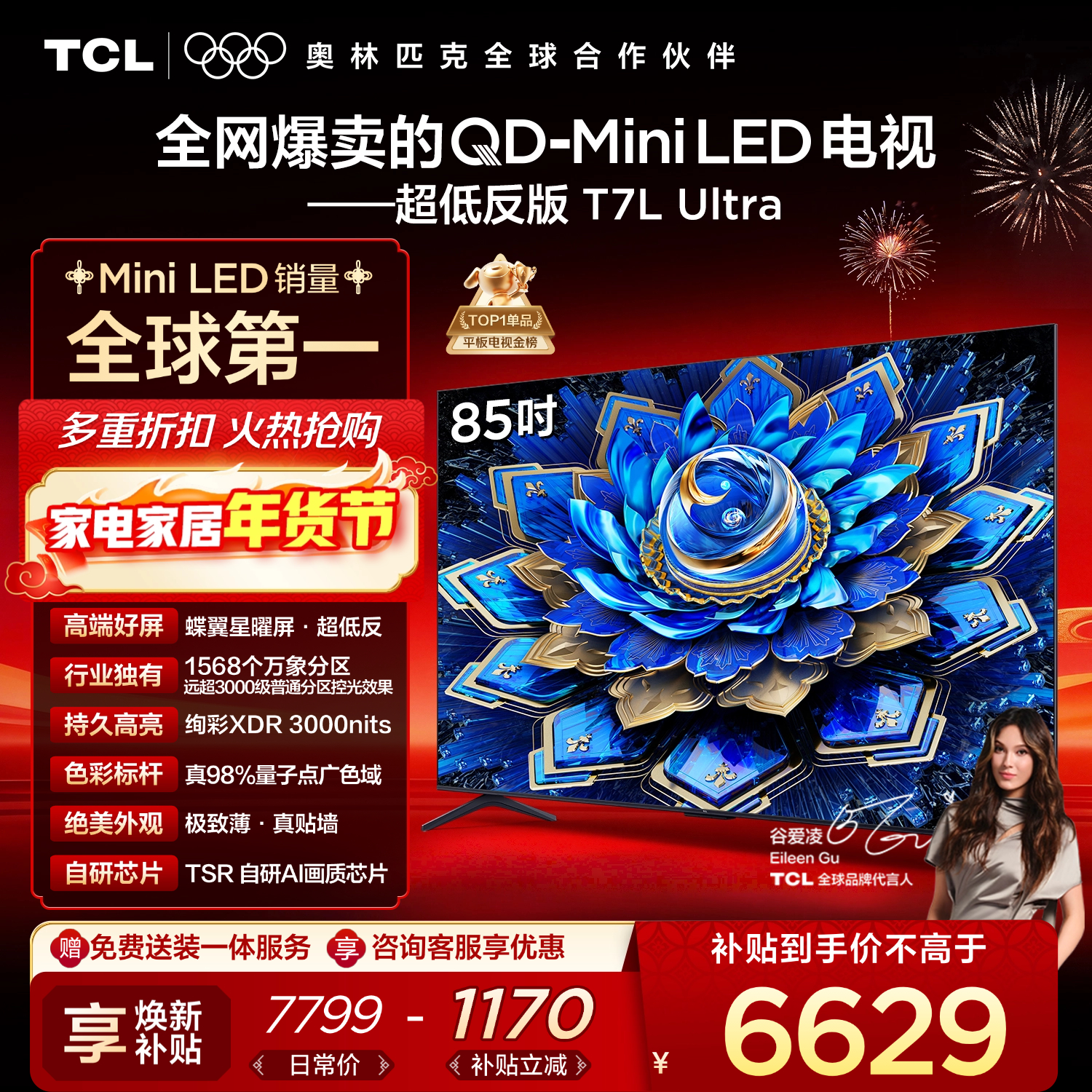 自营TCL 85T7L Ultra 包安装版【固定挂架送装一体】85英寸 QD-Mini LED电视 T7L Ultra 国家补贴