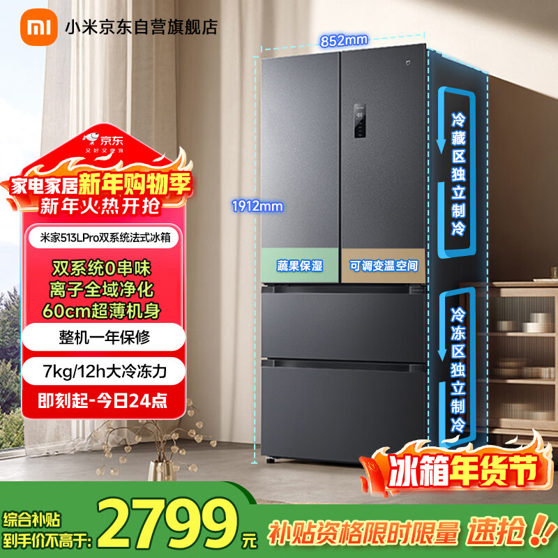 自营米家小米Pro513L法式多门冰箱一级变频双系统双循环超薄家用大容量BCD-513WFTMSA国家补贴