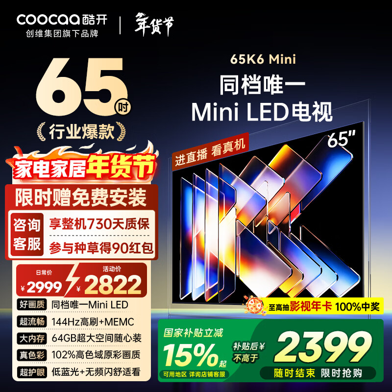 自营酷开品质款 创维65K6 Mini 电视机65英寸 Mini LED 64GB一级能效以旧换新补贴 大屏AI游戏显示器65P5F