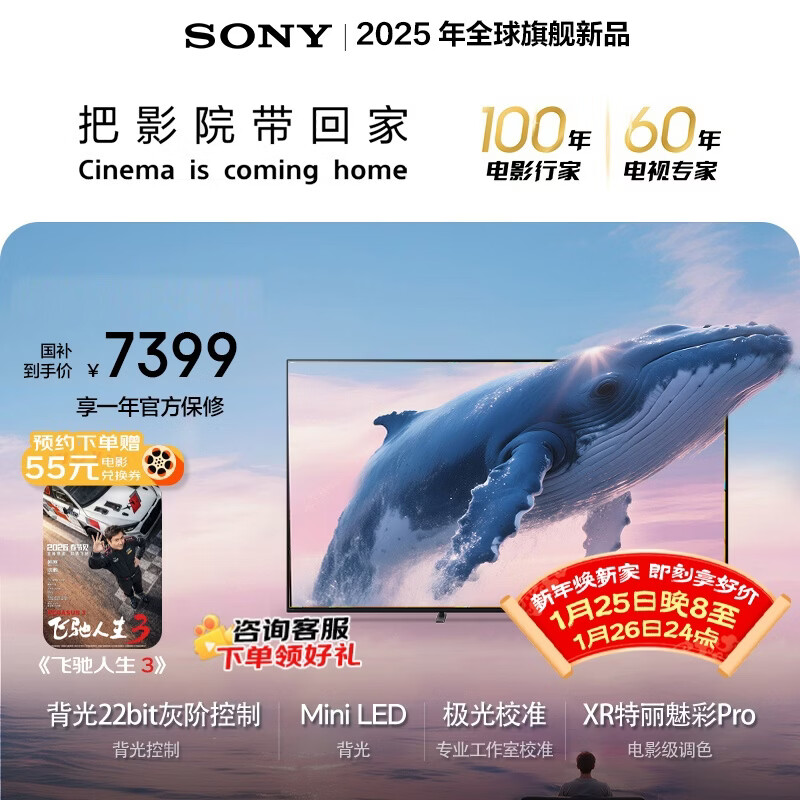 自营索尼(SONY)高端款 5系【京东独家】 K-75XR51Z 75英寸 MiniLed XR芯片 64G 一级能效 国家补贴 平板电视