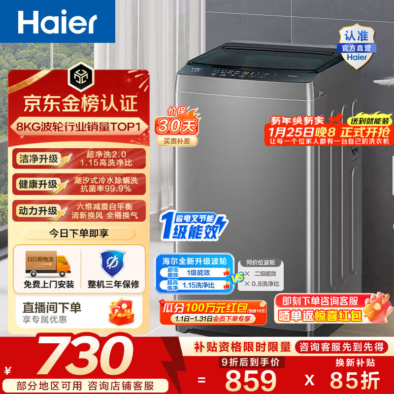 旗舰店海尔(Haier)波轮洗衣机8KG小型全自动 家用洗脱一体Z10D0 以旧换新一级能效 宿舍出租房单脱水家电换新补贴15% 8KG销冠丨金榜认证丨超净洗 波轮