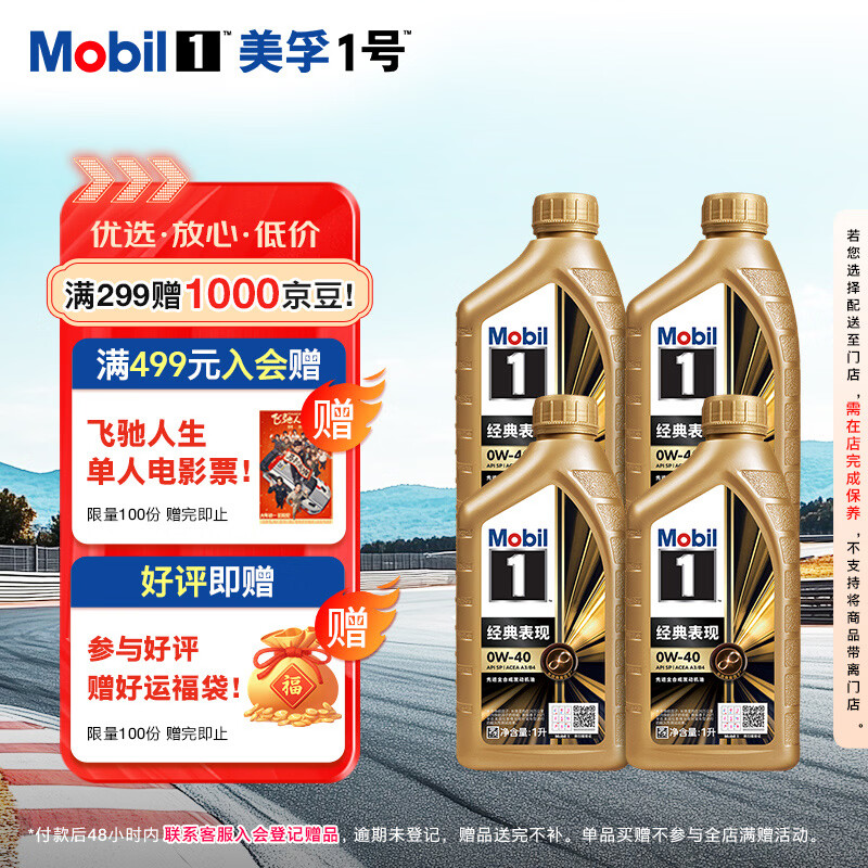 自营美孚(Mobil)金美孚全合成汽机油小金美经典表现 0W-40 SP级 1L*4 汽车保养