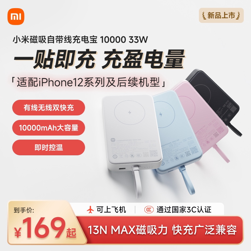 旗舰店【3C认证】小米磁吸自带线充电宝10000 33W快充超薄迷你超大容量便携移动电源适用于华为小米苹果可上飞机