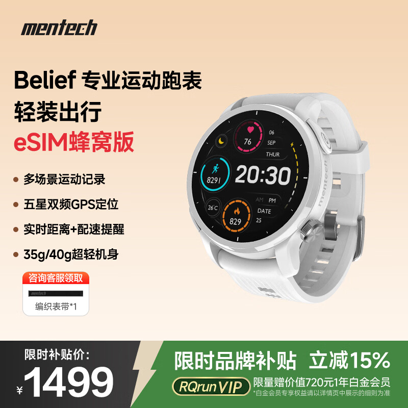 旗舰店mentech 美炭|Belief智能手表 心率血氧跑步铁三游泳户外运动手表 蜂窝eSIM版 川藏白-45mm