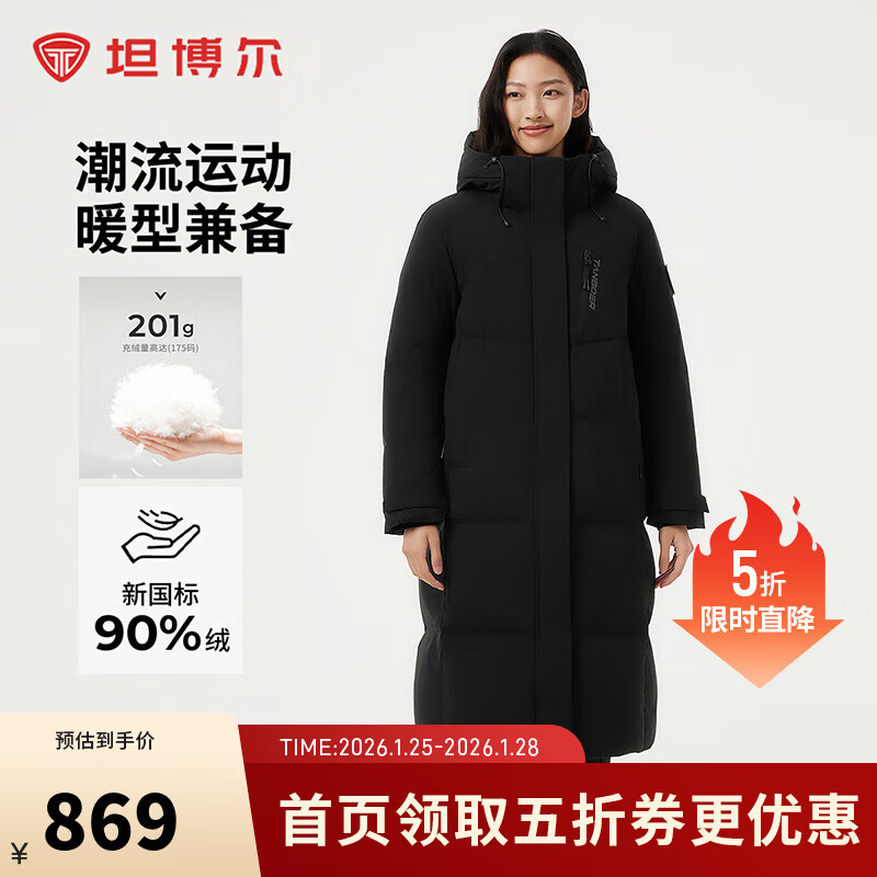 旗舰店坦博尔羽绒服女长款运动休闲简约保暖厚款连帽外套 黑色 160 84A